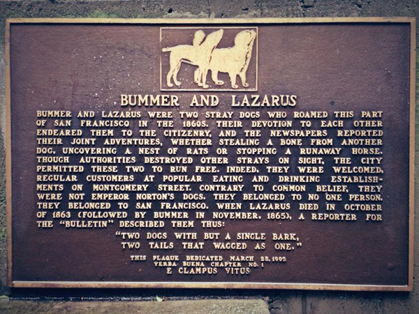 San Francisco in the 1860s, begging for handouts and patrolling the area for rats to kill. They were also good pals who were unified in all they did. Bummer was said to do the biting; Lazarus the barking.