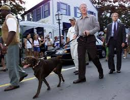 tossing a ball for Buddy on the White House lawn as well as in Chappaqua, and Chappaqua residents reported that Bill frequently took the dog with him into town where residents loved to see him. One shop owner said that people were far more likely to report that they had “just seen Buddy,” than they were to say they had just seen Bill.