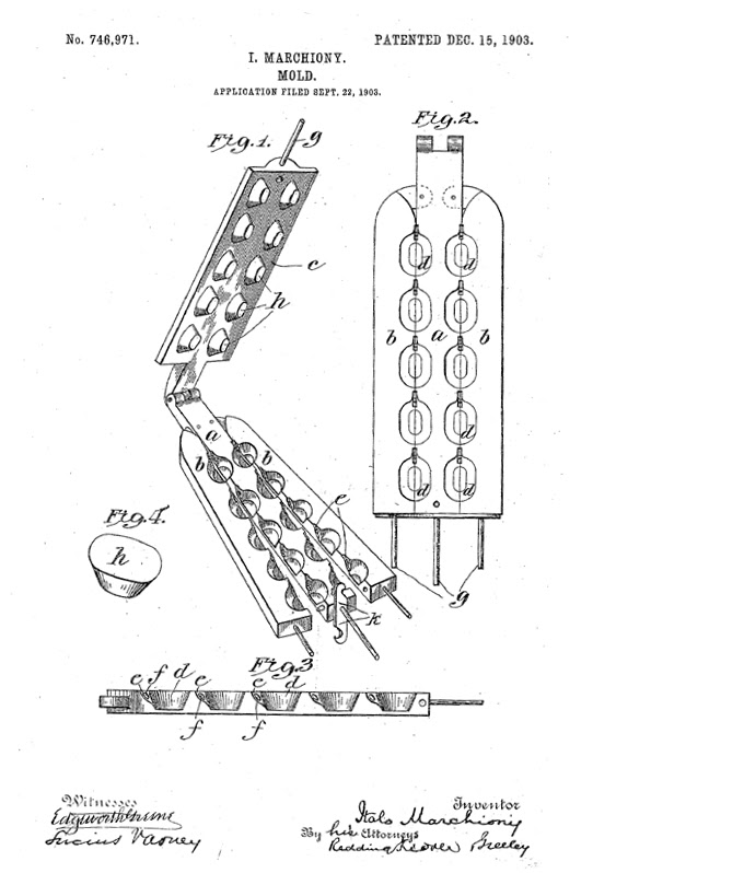 The patent for cone-making was awarded to Italo Marchiony (1868-1954) in 1903. Marchiony was a street vendor on Wall Street where he sold lemon ices from a pushcart to Wall Street brokers and runners. He had been working on a cone-making device since 1896 and filed for a patent in 1902.