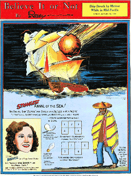 “Ripley’s Believe It or Not!” column, a wildly popular newspaper panel series and radio program during the 1930s and ’40s. The phrase, “Believe It or Not” became a well-known saying of the day.