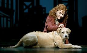 As a performer, Sandy had several responsibilities. He needed to arrive on stage when called and greet Annie warmly by putting his front paws up on her shoulders. He then needed to lie quietly beside Annie while she sang “Tomorrow.”