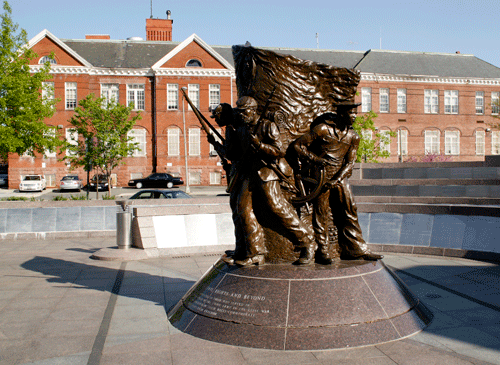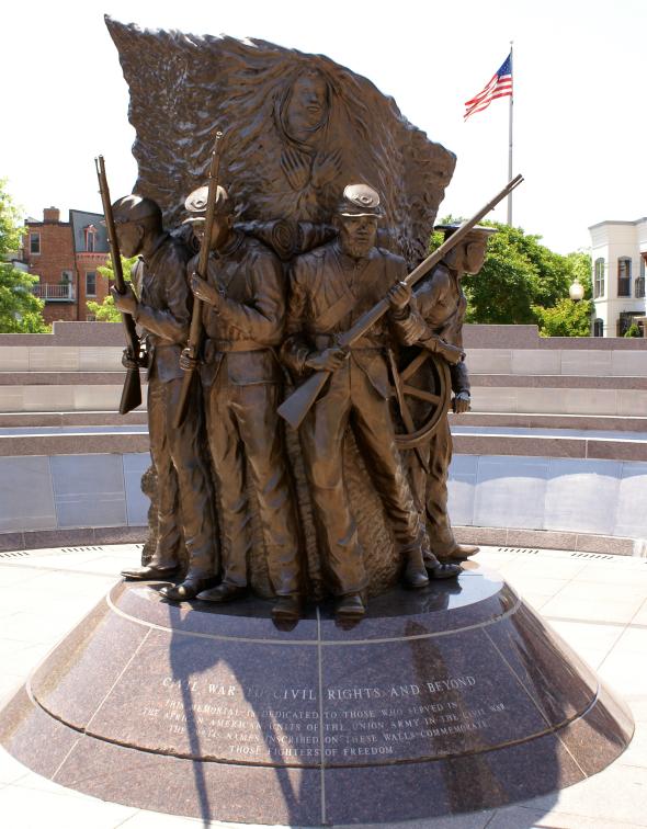 The more recent memorial, dedicated in 1998, is much more pleasing to today’s population. The focal point of the memorial is three black Union infantrymen and one black Union sailor. All four are standing resolutely. They hold guns, and the inscription reads: “Civil War to Civil Rights and Beyond.”